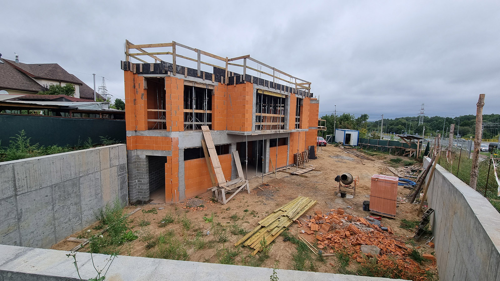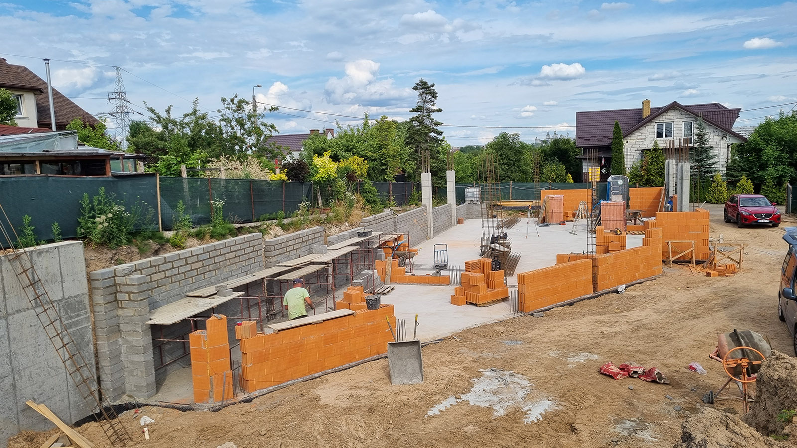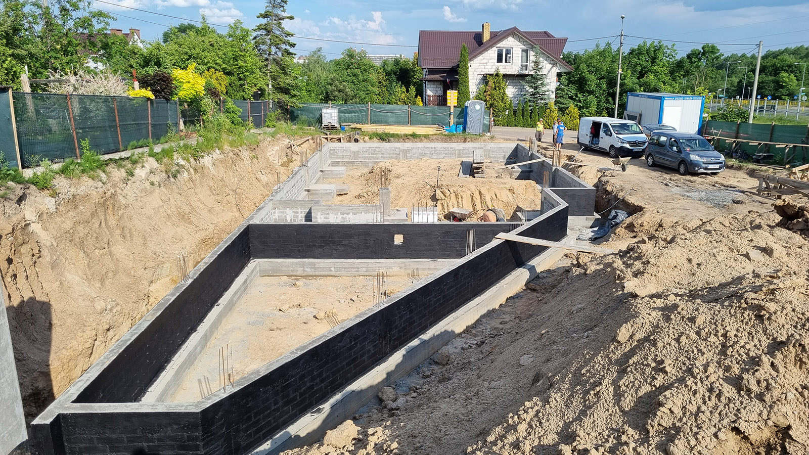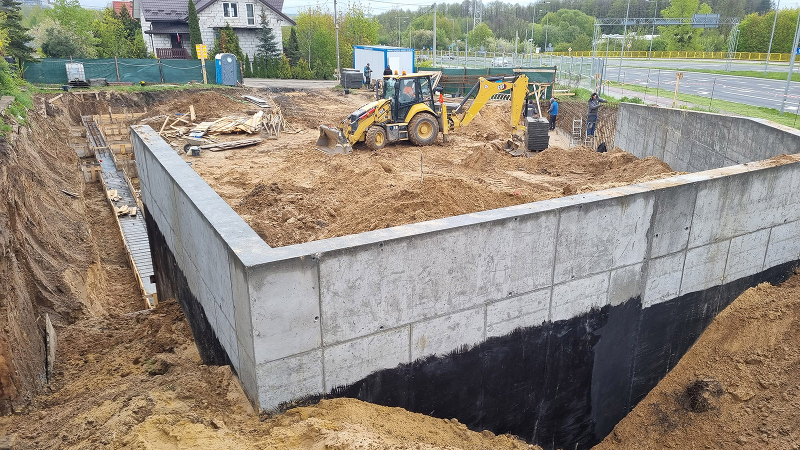 Z uwagi, iż budynek został posadowiony na zboczu skarpy zastosowano żelbetowy mur oporowy o wysokości 3 metrów.