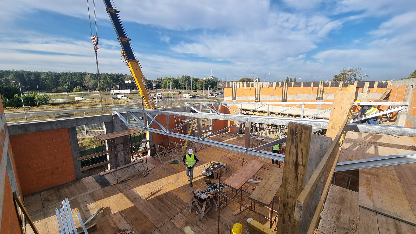 Konstrukcja budynku słupowo-ryglowa. Dźwigary stalowe na słupach żelbetonowych o wysokości 8,50 m. Konstrukcja dachu stężona układem rozpór.