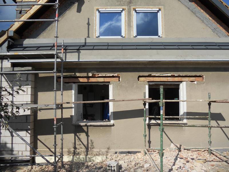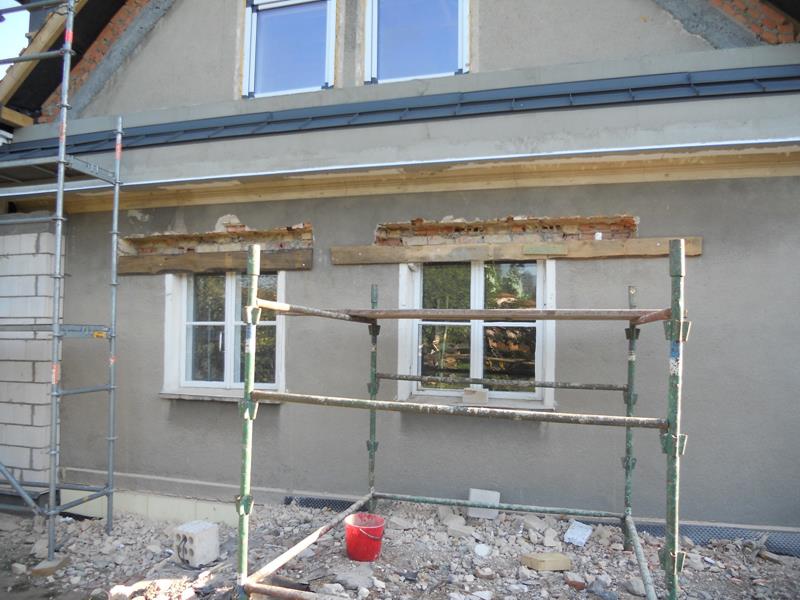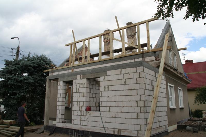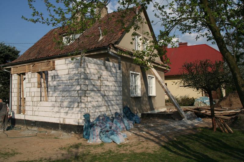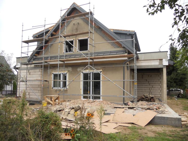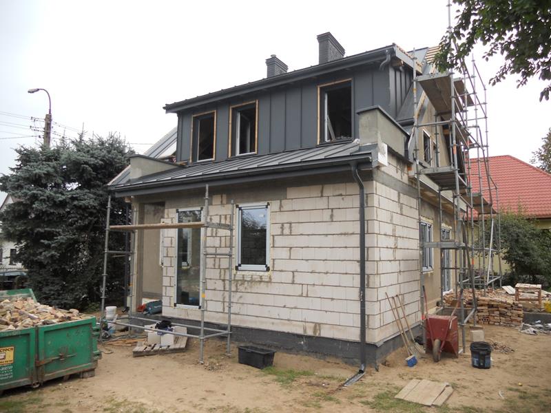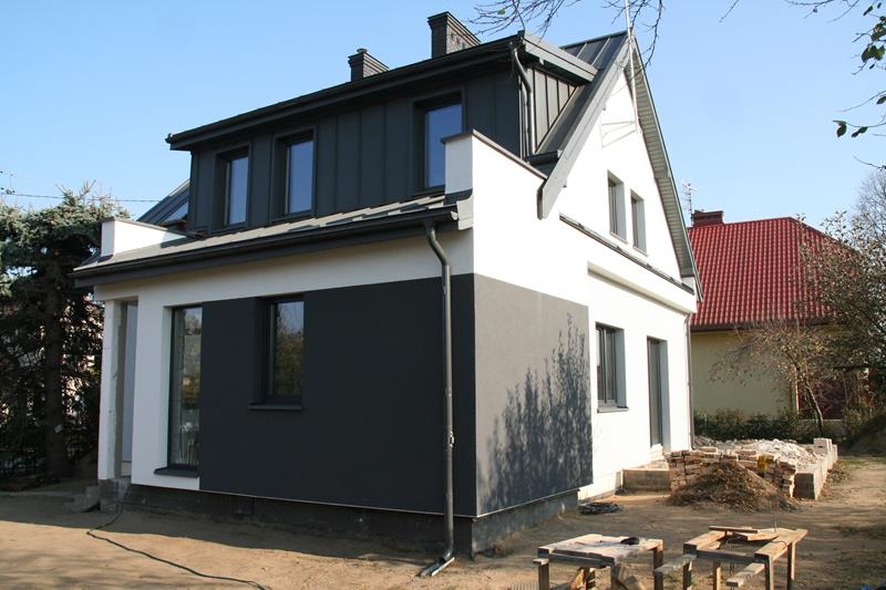 Budynek został powiększony o attykę, garderobę, wiatrołap, a także rozbudowę łazienki. Dodatkowo podwyższono i wymienioną na nową całą konstrukcję dachową. Dzięki temu piętro uzyskało dużo większą przestrzeń i umożliwiło bardziej ekonomiczne rozłożenie pomieszczeń. Rozbudowane elementy zostały wykonane z bloczków NF6 na zaprawie cementowo-wapiennej, pokrycie dachowe oraz fasady zostały obłożone blachą panelową Rukki Classic w kolorze grafitowym, kominy wykonane z cegły klinkierowej NF10. Trzy szybowe, pięciokomorowe okna firmy Petecki z Łodzi. Zachęcamy do obejrzenia galerii z realizacji.