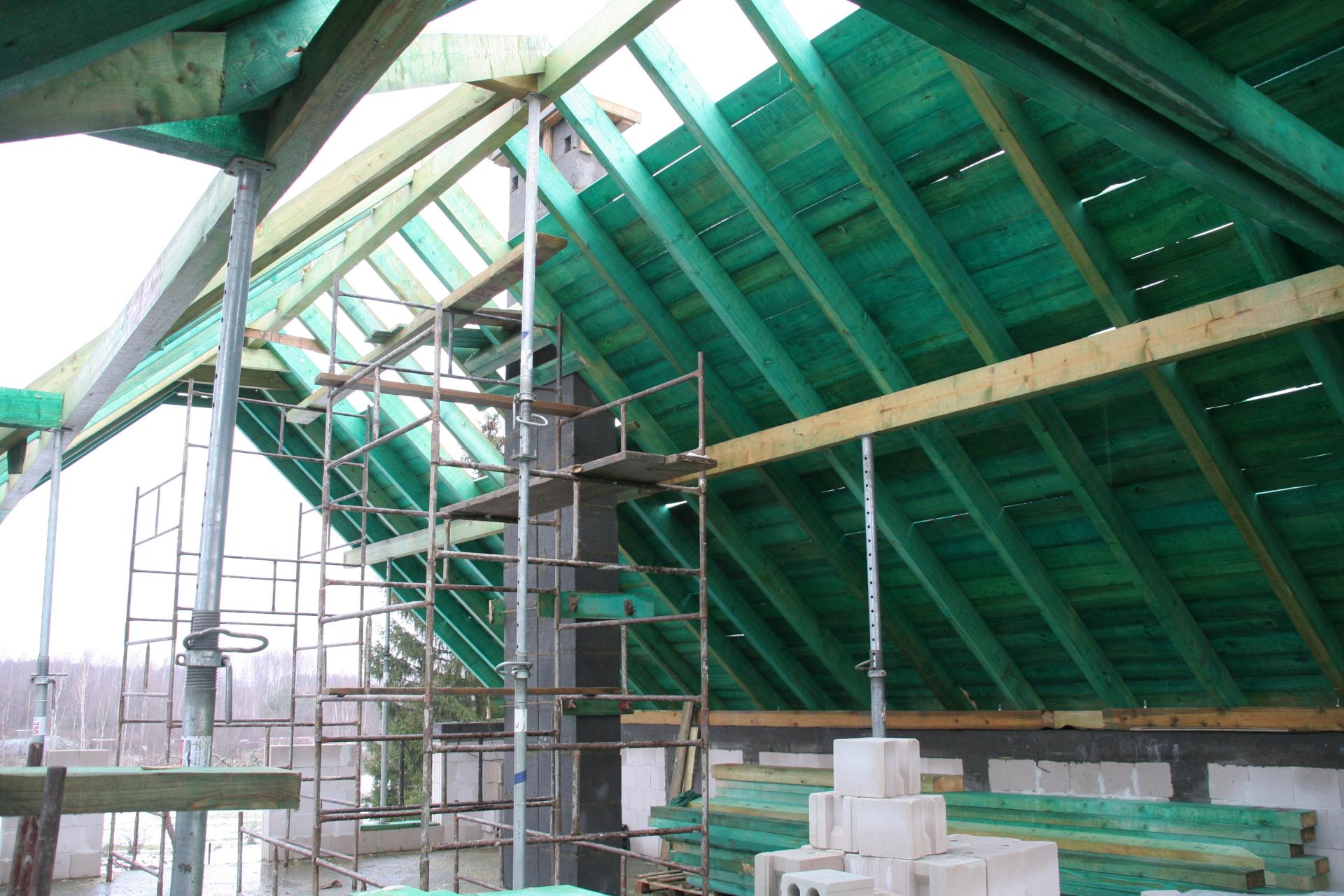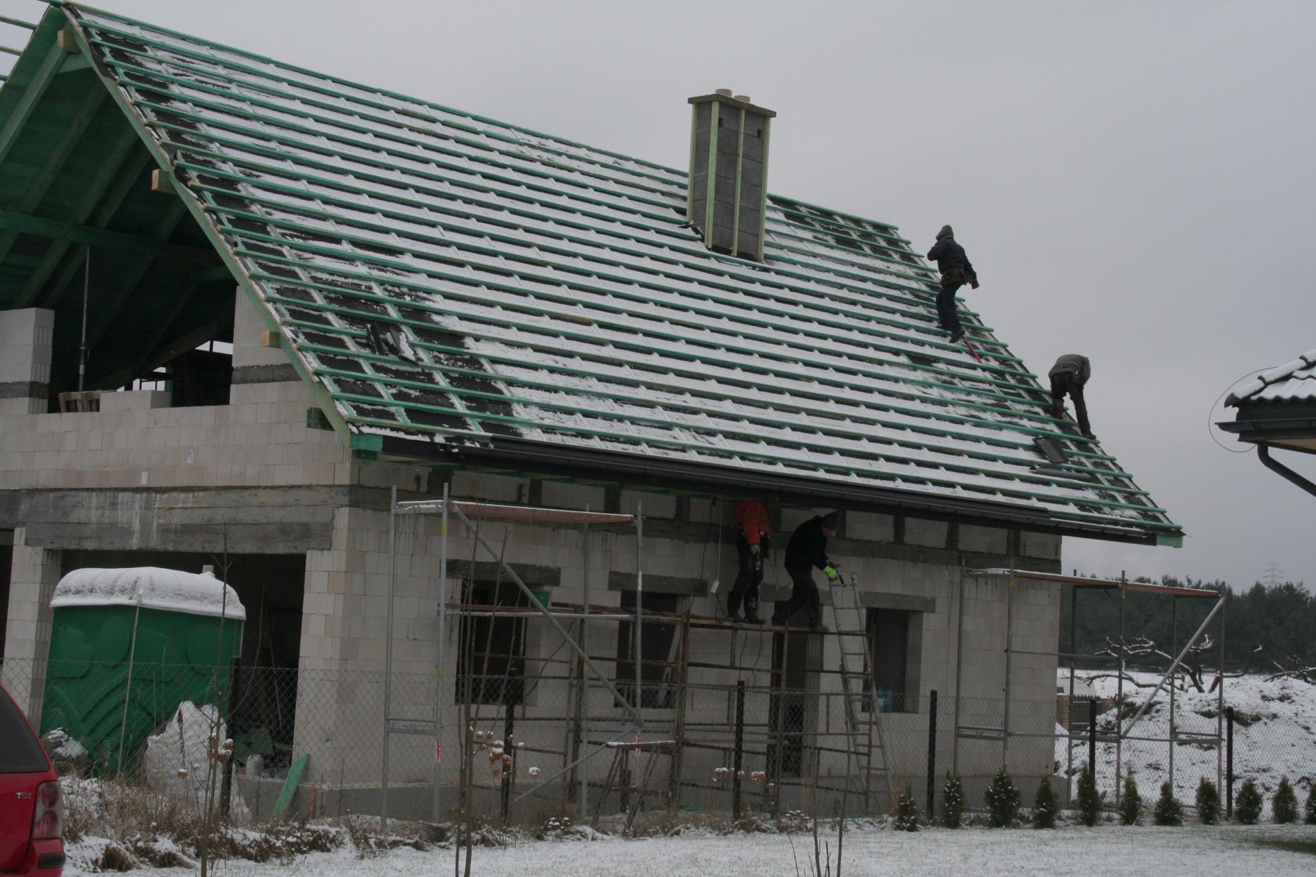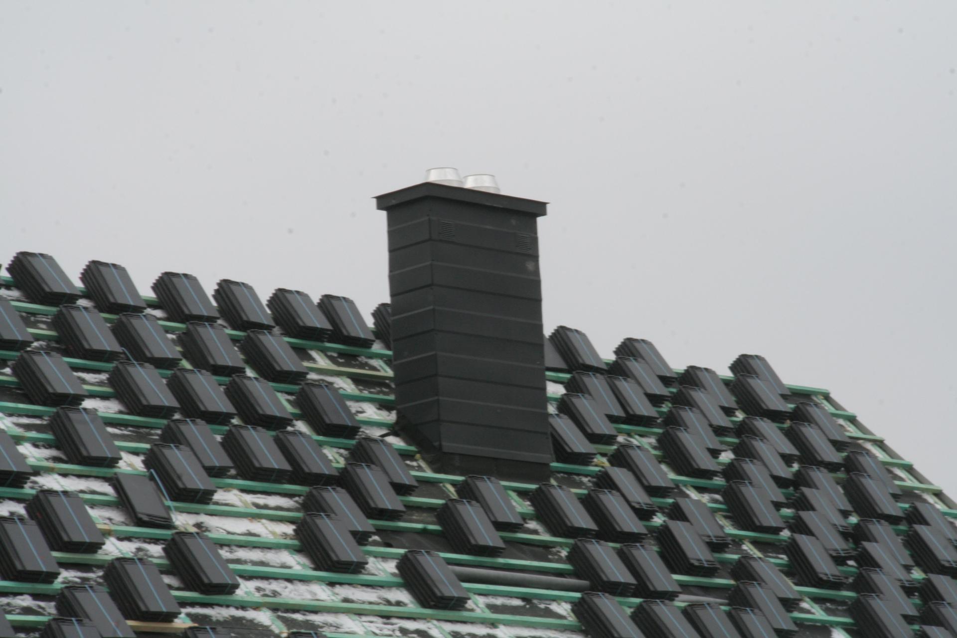 Pokrycie dachowe z dachówki ceramicznej Koramic Orea 9 w kolorze szarym. Orynnowanie metalowe. Kominy systemowe firmy Brata. Obróbka komina plachą powlekaną w kolorze szarym.